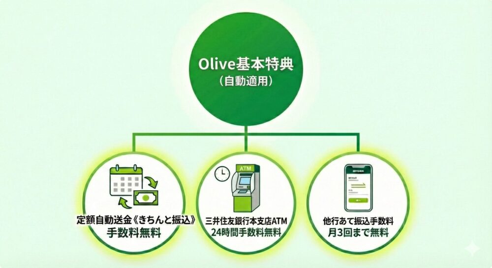 選べる特典というサービスがあり、三井住友銀行に1万円以上の預金があれば、毎月100ポイント付与。給与受取口座に指定で毎月200ポイント付与などの特典を選べます。そのほか、振込手数料が月3回無料や、本支店ATMが24時間手数料無料になるなど、Oliveフレキシブルペイを使う・使わないを問わず、誰でもメリットを得られます。