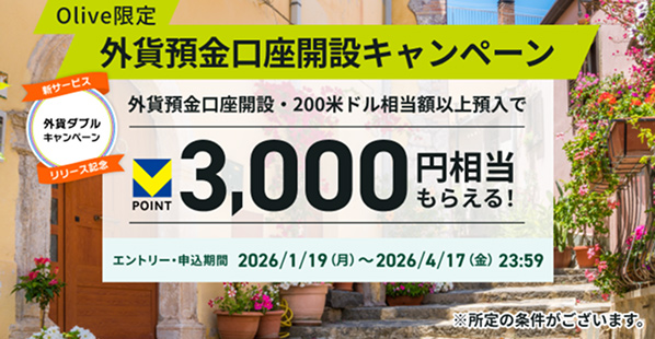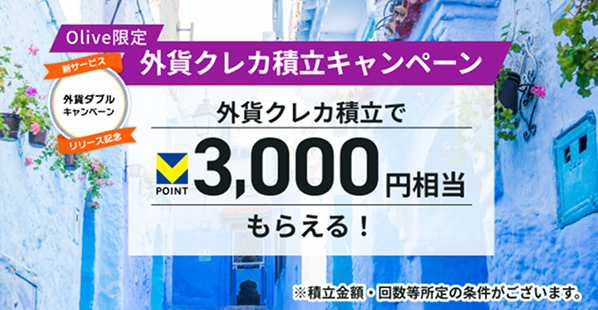 | 条件 | ①Olive新規入会 ②エントリー ③一度に10万円以上をOlive口座に入金 | ①公式サイトからエントリー+翌々月までにOlive口座での一度に3万円以上の給与受取 ②選べる特典を「給与・年金受取特典」に設定 | 新規入会+申込み月の翌月末までにスマホのタッチ決済を1回 | 新規入会1ヵ月後末までのスマホのVisaタッチ決済の利用金額×20%分のVポイントPayギフトを付与 | SBI証券の口座開設+エントリー+Ⅴポイント登録 | ①を達成した上で、SBI証券の仲介口座(NISA口座)開設2ヵ月後10日時点のクレカ積立利用金額に対して、最大2,500pt(クレカ積立利用金額の最大5%) | ①・②を達成した上で、期間中に各種証券取引条件達成。 SBI証券の仲介口座開設3ヵ月後10日時点のクレカ積立決済金額に対して、達成した条件の組み合わせによって、最大14% | ①エントリー ②SMBCダイレクトから外貨預金口座開設・預入(200米ドル相当額以上) ※2026年6月30日(火) 15時の残高 ※10,000米ドル以上預入の場合は50,000ptに増額 | ①エントリー ②外貨自動積立サービス(クレジットカード決済)を新規申込 ③積立判定期間内(2026/3/26 ~ 2026/11/26)に1回あたり10,000円以上の外貨クレカ積立を6回以上実行 |
